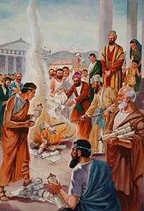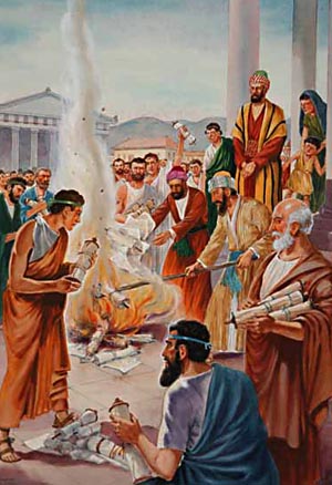 [1] By burning their books on magic, the Ephesian converts showed that the things in which they had once delighted they now abhorred. Illustration © Review and Herald Publ. Assoc. [2] “Demetrius the silversmith stirs up a riot” by Edward H. Corbould, 1894. [3] “The riot at Ephesus” – Artist unknown