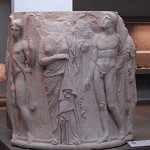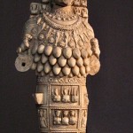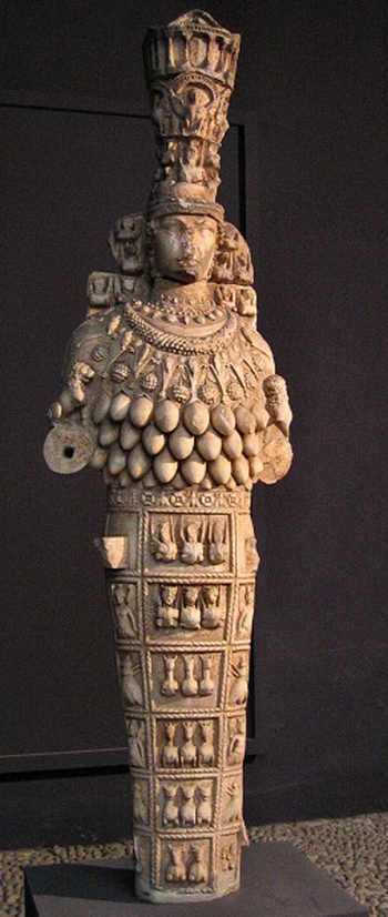 [1] Model of the Temple of Artemis, in Miniaturk Park, Istanbul. [2] A column base with carvings preserved in the British Museum. [3] Greek goddess Artemis.